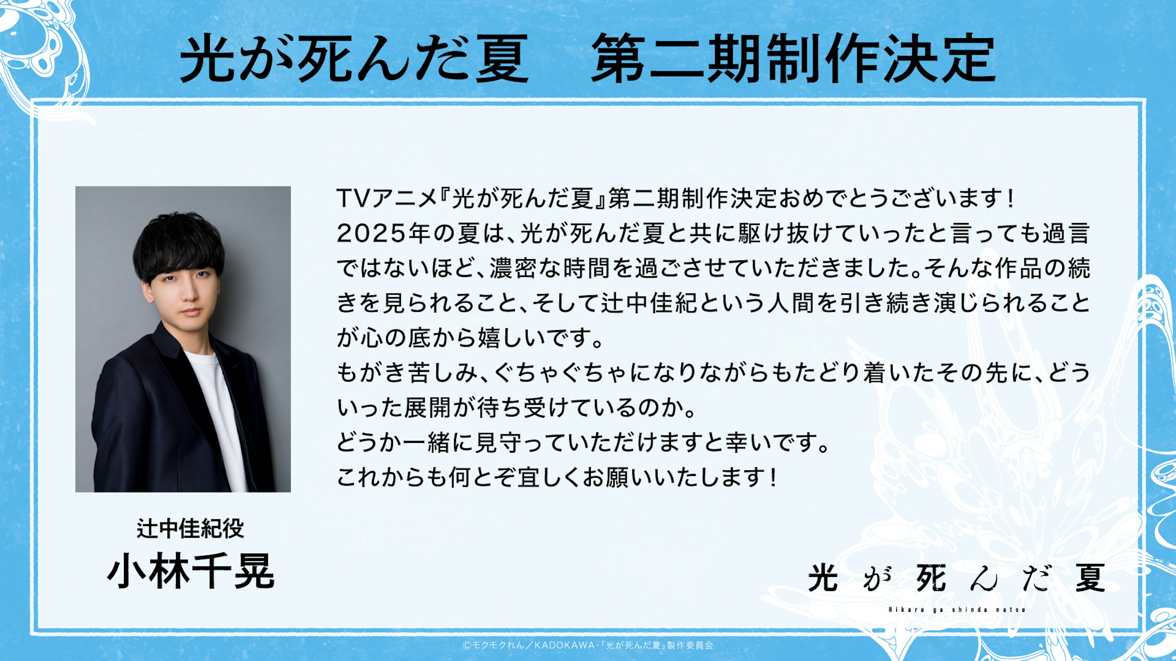 TVアニメ『光が死んだ夏』(サイバーエージェント、KADOKAWA共同幹事作品)において第二期の制作が決定したことをお知らせいたします。