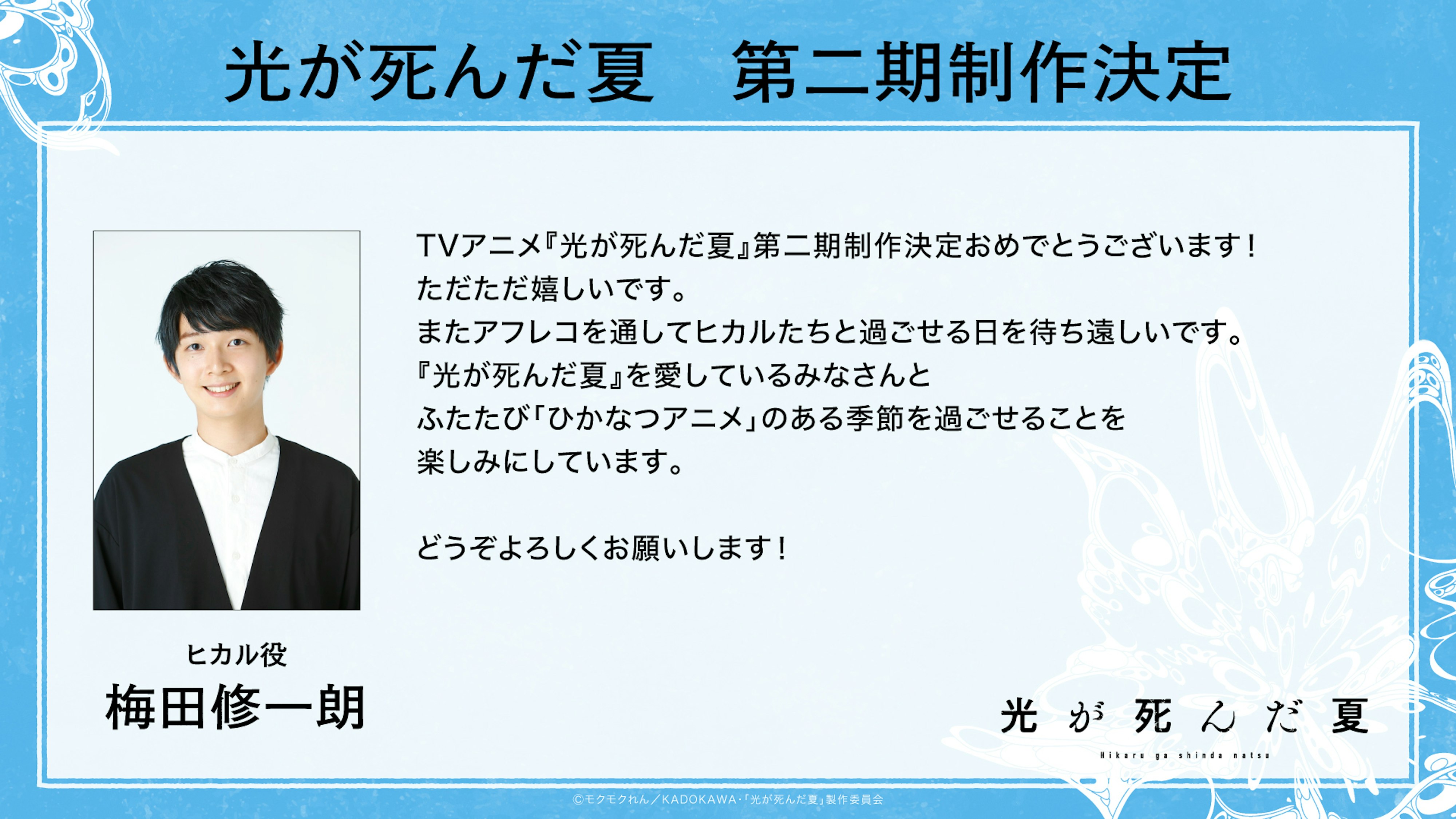 TVアニメ『光が死んだ夏』(サイバーエージェント、KADOKAWA共同幹事作品)において第二期の制作が決定したことをお知らせいたします。